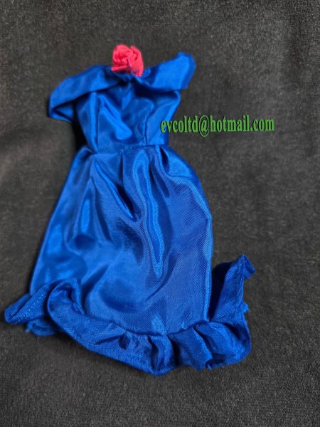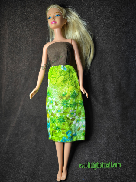 These dresses are designed to Barbie specifications and fits many dolls of a similar size. It is made from over 95% remnant materials. They are individually made, machine and partially handstitched.